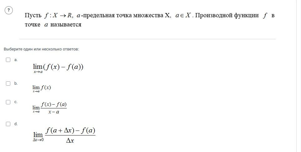 - b. $$ \lim_{x \to a} f(x) $$ - Это выражение представляет собой предел функции f(x) при x, стремящемся к a. Это не является определением производной.