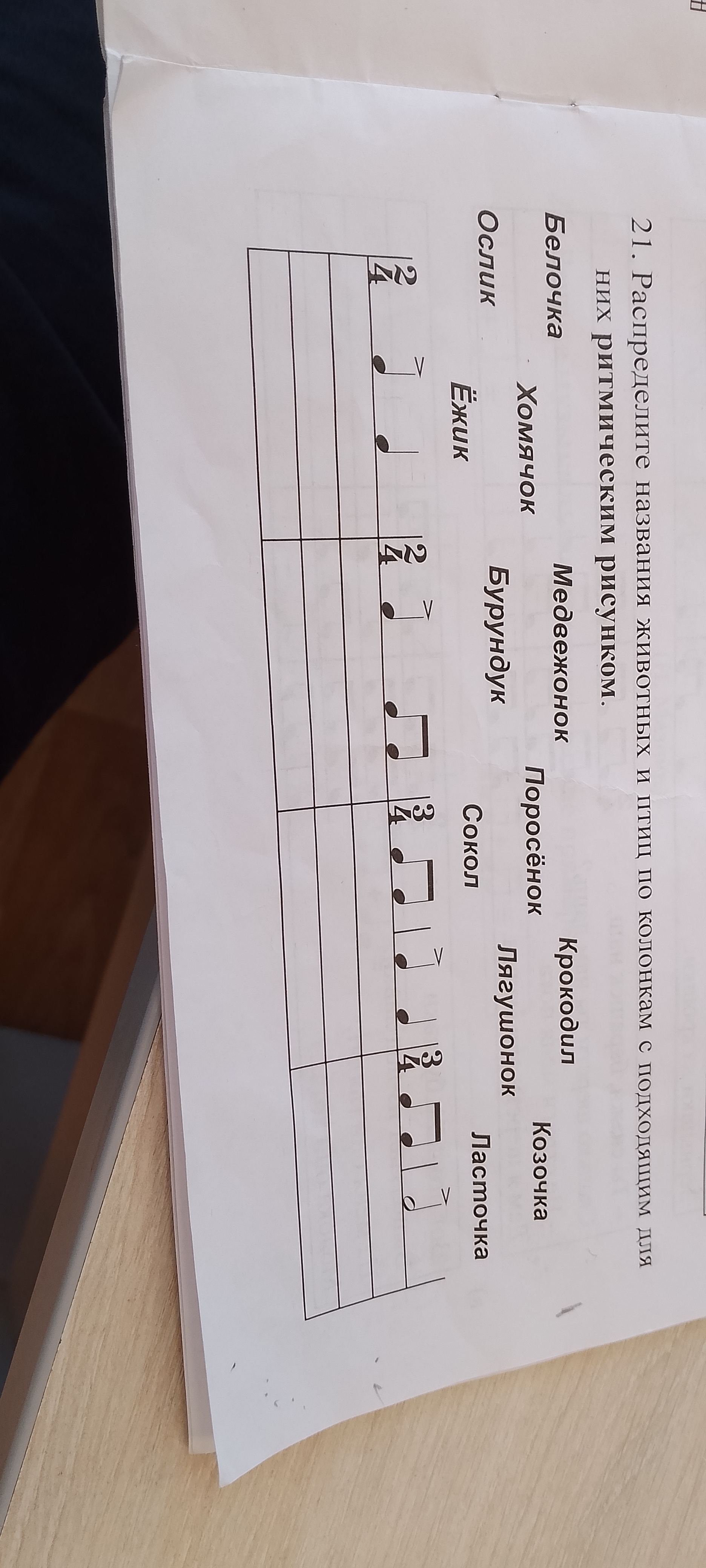 Распределите названия животных и птиц по колонкам с подходящим для них ритмическим рисунком.