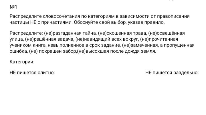Для выполнения данного задания, необходимо распределить представленные словосочетания по категориям, в зависимости от того, как пишется частица НЕ с причастиями: слитно или раздельно. При этом нужно обосновать свой выбор, указав правило.