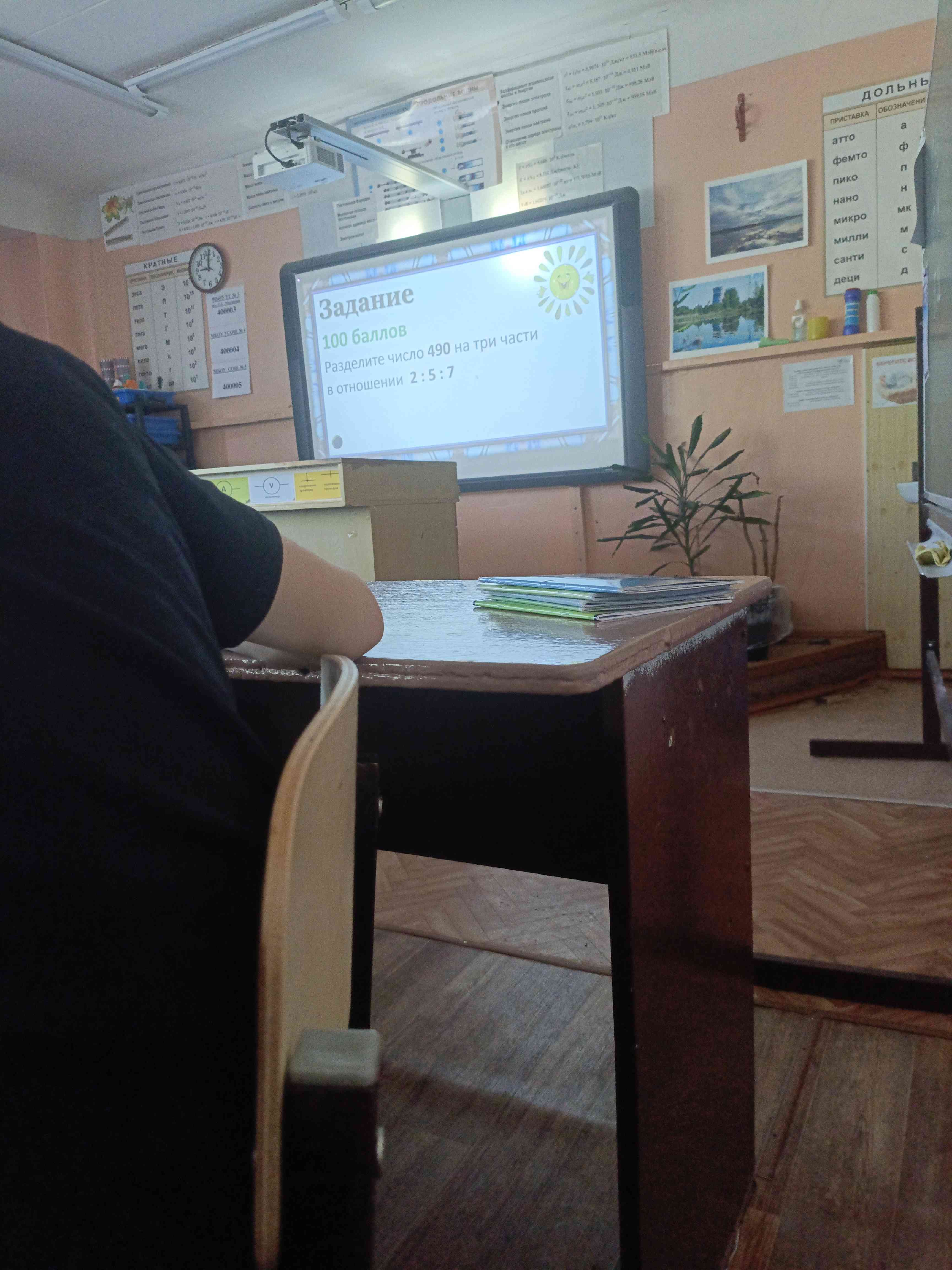 Разделить общее число (490) на сумму частей, чтобы узнать, сколько приходится на одну часть отношения.