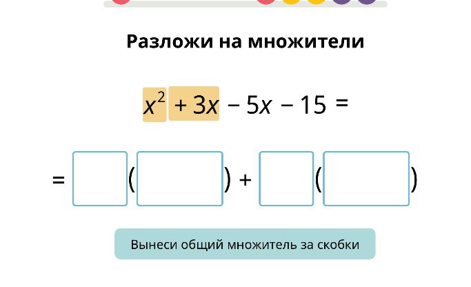 $$x^2 + 3x - 5x - 15 = (x^2 + 3x) + (-5x - 15)$$Вынесем общий множитель из каждой группы: