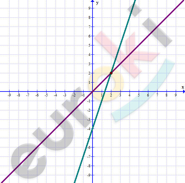 \[\left\{ \begin{matrix} y - x = 0\ \ \\ 3x - y = 4 \\ \end{matrix} \right.\ \text{\ \ \ \ \ \ \ \ \ \ \ }\left\{ \begin{matrix} y = x\ \ \ \ \ \ \ \ \ \ \ \\ y = 3x - 4 \\ \end{matrix} \right.\ \]