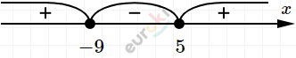 \[\mathbf{Ответ:\ }x \in ( - \infty;\ - 9\rbrack \cup \lbrack 5; + \infty).\]