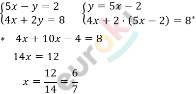 \[\left\{ \begin{matrix} x = \frac{6}{7}\text{\ \ \ \ \ \ \ \ \ \ \ \ \ \ \ \ \ \ \ \ \ \ \ \ \ \ \ \ \ \ \ \ \ \ \ } \\ y = \frac{5\ \cdot 6}{7} - 2 = \frac{30}{7} - 2\ \\ \end{matrix} \right.\ \text{\ \ \ \ \ \ \ \ }\]