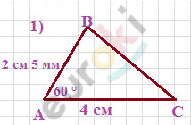 С помощью линейки и транспортира постройте треугольник, если: две его стороны равны 2 см 5 мм и 4 см, а угол между ними – 60°.