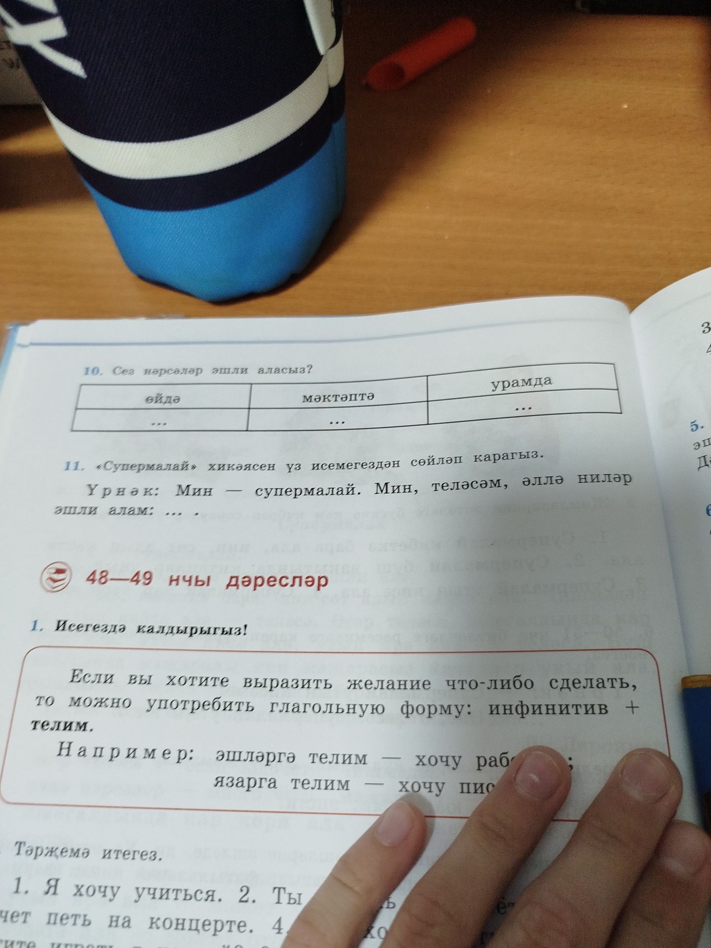 Китап укый алам - умею читать книги, Чәй эчә алам - умею пить чай, Музыка тыңлый алам - умею слушать музыку, Язарга өйрәнә алам - умею учиться писать, Рәсем ясарга өйрәнә алам - умею учиться рисовать, Хикәяләр сөйләргә өйрәнә алам - умею учиться рассказывать истории, Велосипедта йөри алам - умею кататься на велосипеде, Футбол уйный алам - умею играть в футбол, Йөгерә алам - умею бегать.