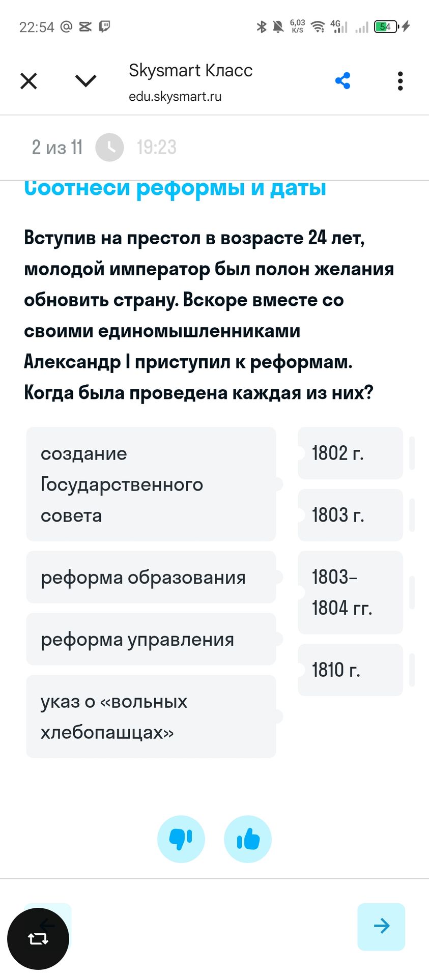 Соотнеси реформы и даты Вступив на престол в возрасте 24 лет, молодой император был полон желания обновить страну. Вскоре вместе со своими единомышленниками Александр І приступил к реформам. Когда была проведена каждая из них? создание Государственного совета реформа образования реформа управления указ о «вольных хлебопашцах»