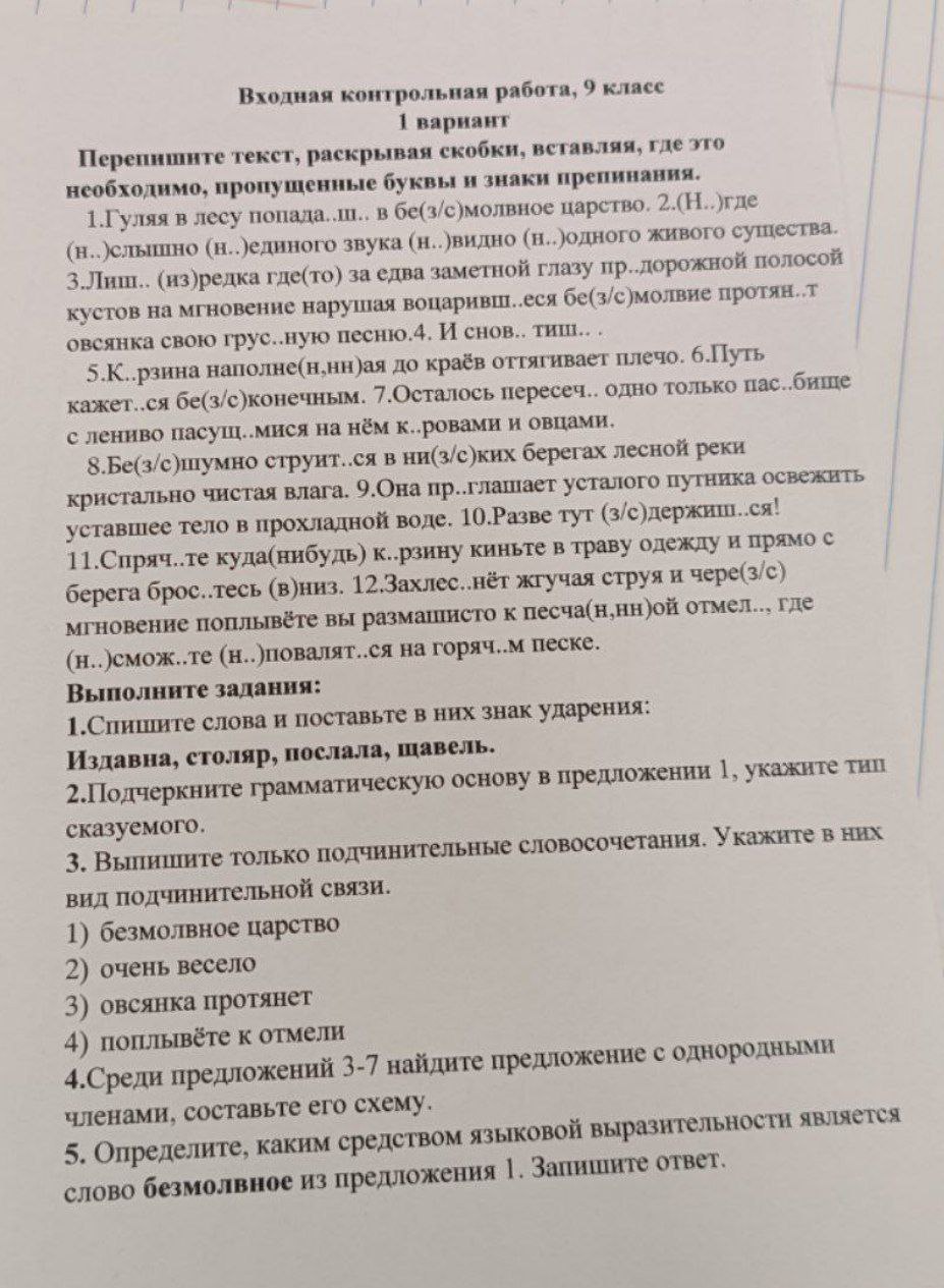 Перепишите текст, раскрывая скобки, вставляя, где это необходимо, пропущенные буквы и знаки препинания. 1.Гуляя в лесу попада..ш.. в бе(з/с)молвное царство. 2.(Н..)где (н..)слышно (н..)единого звука (н..)видно (н..)одного живого существа. 3.Лиш.. (из)редка где(то) за едва заметной глазу пр..дорожной полосой кустов на мгновение нарушая воцаривш..еся бе(з/с)молвие протян..т овсянка свою грус..ную песню.4. И снов.. тиш.. 5.К..рзина наполне(н,нн)ая до краёв оттягивает плечо. 6.Путь кажет..ся бе(з/с)конечным. 7.Осталось пересеч.. одно только пас..бище с лениво пасущ..мися на нём к..ровами и овцами. 8.Бе(з/с)шумно струит..ся в ни(з/с)ких берегах лесной реки кристально чистая влага. 9. Она пр..глашает усталого путника освежить уставшее тело в прохладной воде. 10. Разве тут (з/с) держиш..ся! 11. Спряч..те куда(нибудь) к..рзину киньте в траву одежду и прямо с берега брос..тесь (в)низ. 12.Захлес..нёт жгучая струя и чере(з/с) мгновение поплывёте вы размашисто к песча(н,нн)ой отмел.., где (н..)смож..те (н..)повалят..ся на горяч..м песке.