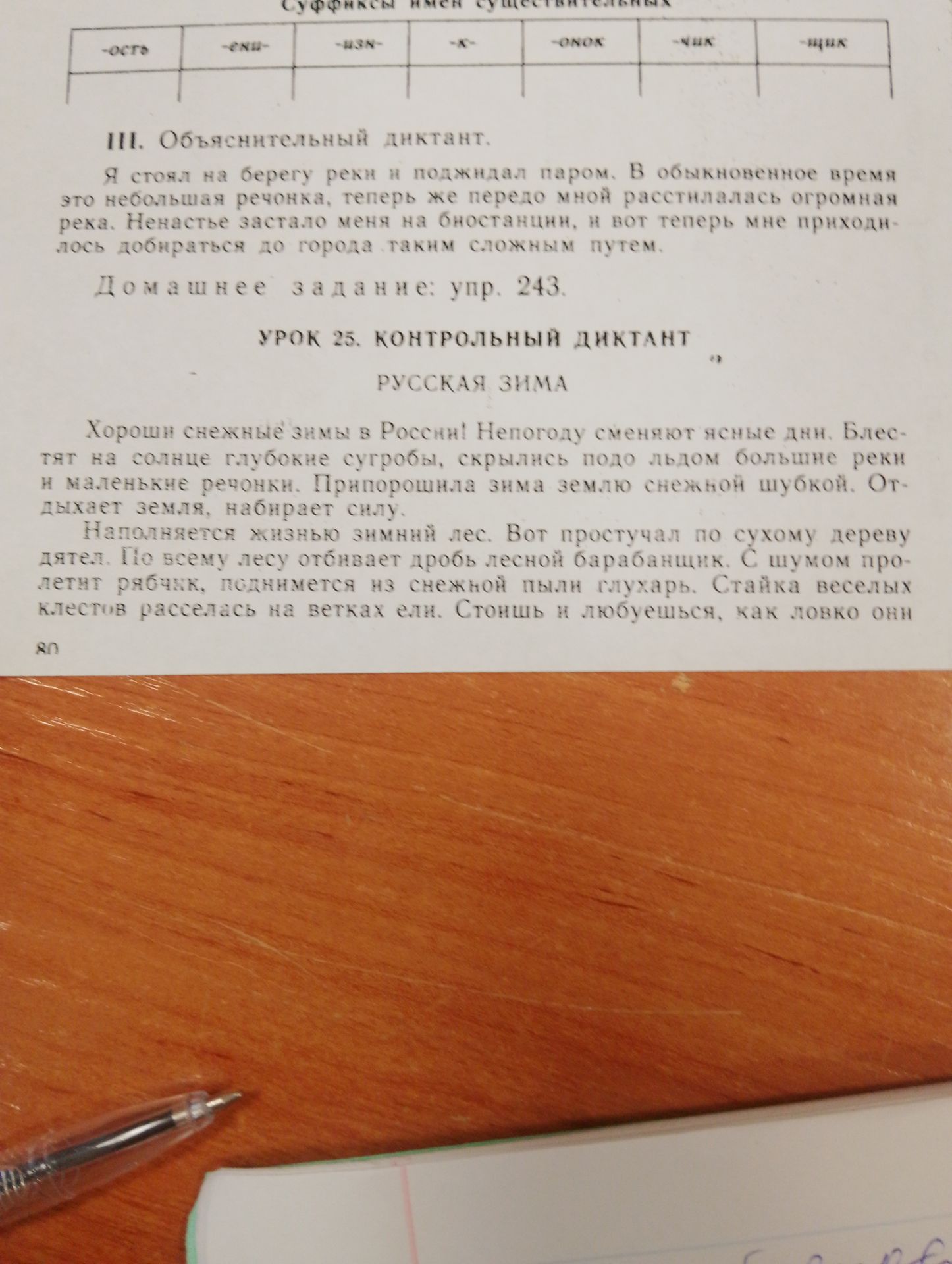 Суффиксы имен существительных -ость -ени- -изм- -к- -онок -чик -щик III. Объяснительный диктант. Я стоял на берегу реки и поджидал паром. В обыкновенное время это небольшая речонка, теперь же передо мной расстилалась огромная река. Ненастье застало меня на биостанции, и вот теперь мне приходи- лось добираться до города таким сложным путем. Домашнее задание: упр. 243. УРОК 25. КОНТРОЛЬНЫЙ ДИКТАНТ РУССКАЯ ЗИМА Хороши снежные зимы в России! Непогоду сменяют ясные дни. Блес- тят на солнце глубокие сугробы, скрылись подо льдом большие реки и маленькие речонки. Припорошила зима землю снежной шубкой. От- дыхает земля, набирает силу. Наполняется жизнью зимний лес. Вот простучал по сухому дереву дятел. По всему лесу отбивает дробь лесной барабанщик. С шумом про- летит рябчик, поднимется из снежной пыли глухарь. Стайка веселых клестов расселась на ветках ели. Стоишь и любуешься, как ловко они 80