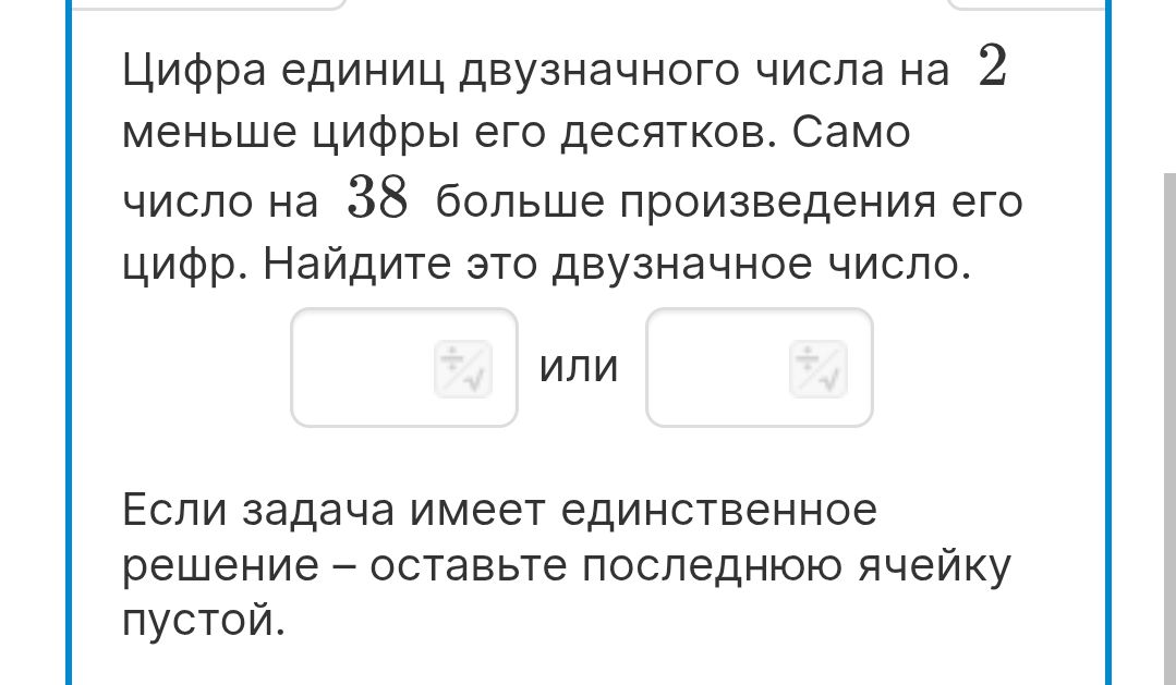 Если x = 8, то y = 8 - 2 = 6. Число равно 86. Проверим: 86 = 8 * 6 + 38 = 48 + 38 = 86. Все верно.