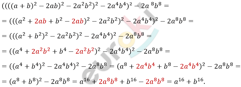\[\left( \left( \left( (a + b \right)^{2} - 2ab \right)^{2} - 2a^{2}b^{2} \right)^{2} - 2a^{4}b^{4})² - 2\text{a\ }^{8}b^{8} =\]