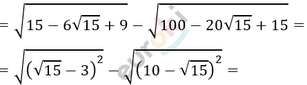 \[= \left| \sqrt{15} - 3 \right| - \left| 10 - \sqrt{15} \right| =\]