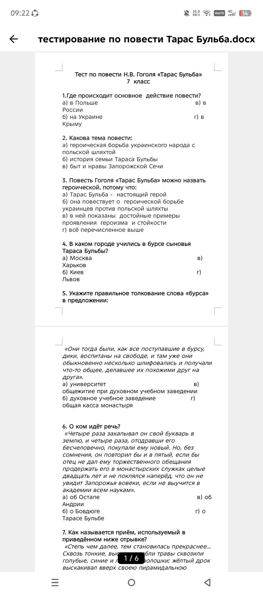 6. О ком идёт речь? «Четыре раза закапывал он свой букварь в землю, и четыре раза, отодравши его бесчеловечно, покупали ему новый. Но, без сомнения, он повторил бы и в пятый, если бы отец не дал ему торжественного обещания продержать его в монастырских служках целые двадцать лет и не поклялся наперёд, что он не увидит Запорожья вовеки, если не выучится в академии всем наукам». а) об Остапе Андрии 6) о Бовдюге Тарасе Бульбе в) об г) о