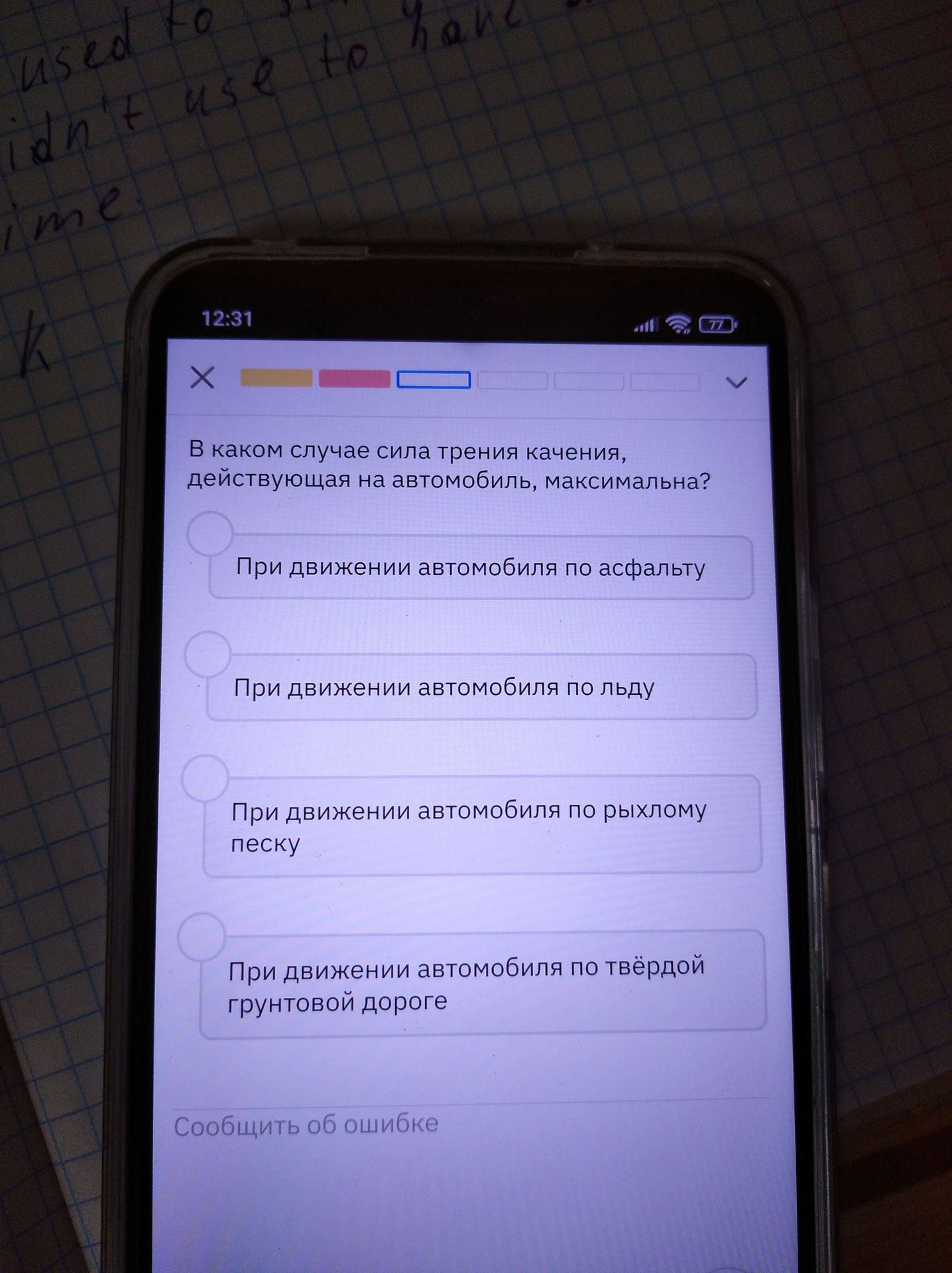 Исходя из представленных вариантов, максимальная сила трения качения будет при движении автомобиля по асфальту.