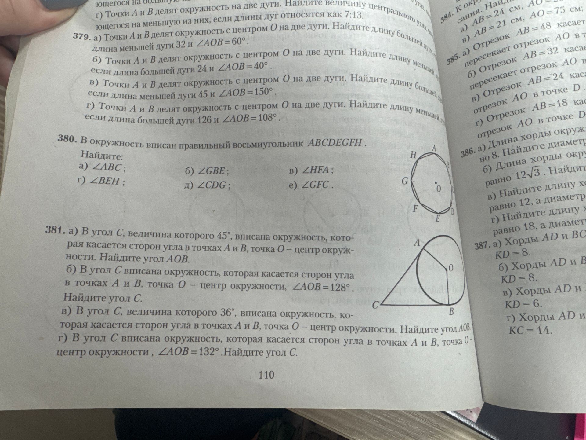 б) ∠GBE состоит из угла ∠GBC и угла ∠CBE. Угол ∠GBC равен половине угла восьмиугольника, то есть $$\frac{135^{\circ}}{2} = 67.5^{\circ}$$. Угол ∠CBE равен углу ∠ABC минус угол ∠ABE. Угол ∠ABE равен углу ∠ABC минус угол ∠EBC. $$∠EBC = \frac{3}{8} \cdot 360^{\circ}$$. Четыре стороны делят окружность на 8 частей. Угол ∠ABE = 135 − ∠EBC. Надо найти ∠EBC. ∠GBE = ∠GBC + ∠EBC.
