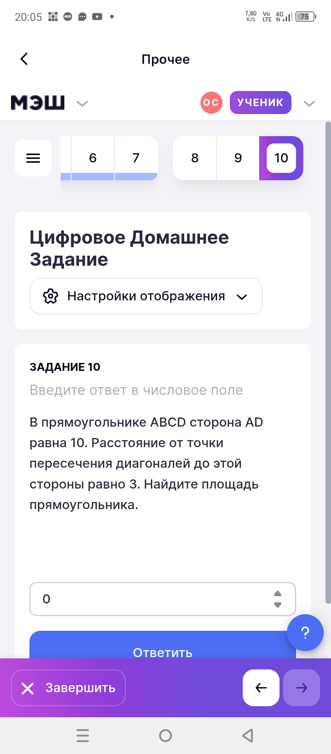 Дано: прямоугольник ABCD, AD = 10, расстояние от точки пересечения диагоналей до стороны AD равно 3.