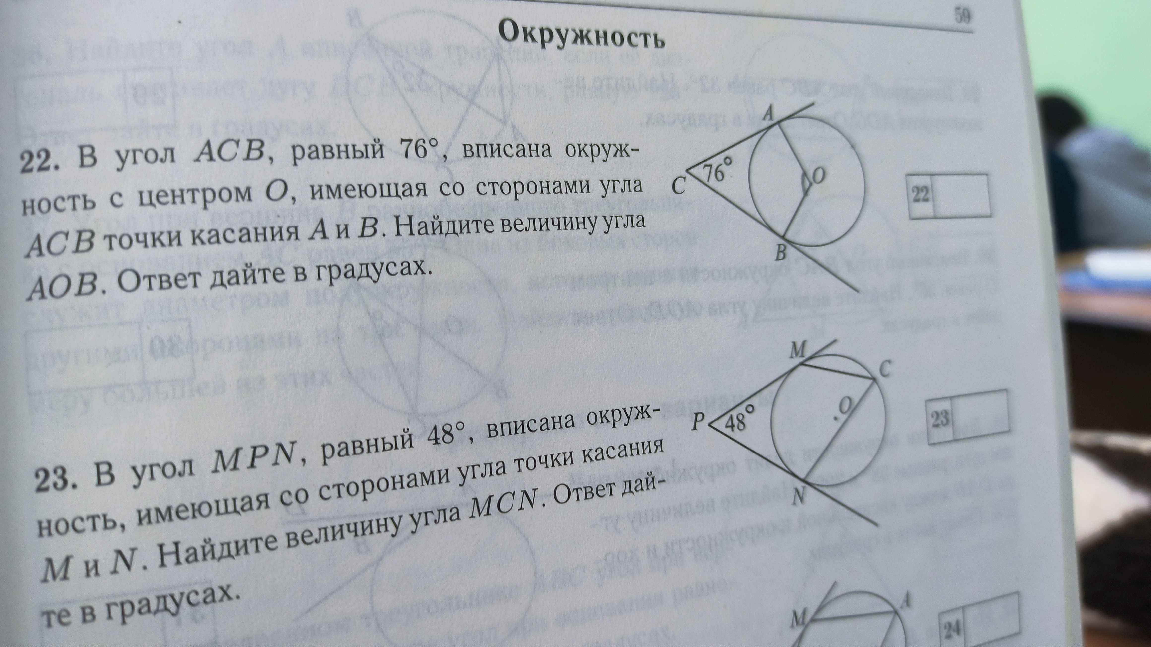 Дано: ∠ACB = 76°, окружность с центром O вписана в ∠ACB, A и B - точки касания окружности и сторон угла.