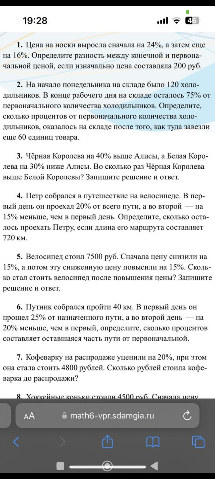 5. Велосипед стоил 7500 руб. Сначала цену снизили на 15%, а потом эту сниженную цену повысили на 15%. Сколь- ко стал стоить велосипед после повышения цены? Запишите решение и ответ.