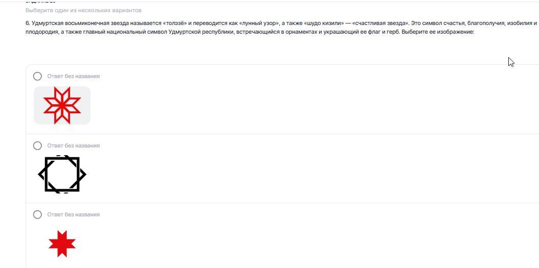 Удмуртская восьмиконечная звезда, известная как «толэзё» или «шудо кизили», является символом счастья, благополучия и плодородия, а также национальным символом Удмуртской Республики. Ее можно увидеть на флаге и гербе республики. На изображении представлена данная звезда.