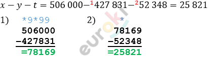 Вычислите значение выражения x-y-t, если x=506 000; y=427 831; t=52348.