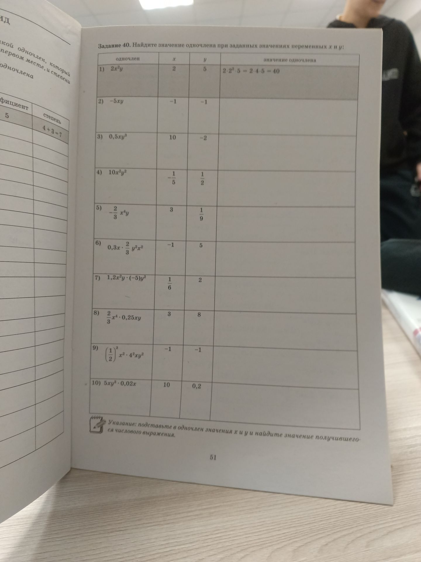 7) Подставим значения переменных x и y в одночлен $$1,2x^2y \cdot (-5)y^2$$: $$1,2 \cdot (\frac{1}{6})^2 \cdot 2 \cdot (-5) \cdot (2)^2 = 1,2 \cdot \frac{1}{36} \cdot 2 \cdot (-5) \cdot 4 = \frac{1,2 \cdot 2 \cdot (-5) \cdot 4}{36} = \frac{1,2 \cdot (-10) \cdot 4}{36} = \frac{-48}{36} = -\frac{4}{3} = -1 \frac{1}{3}$$.