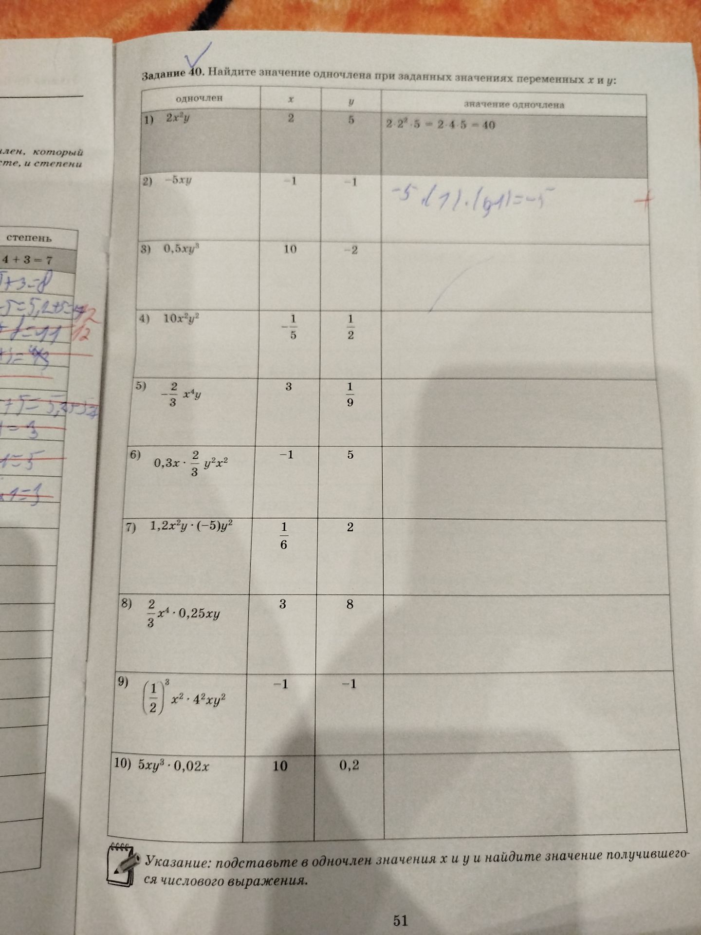 8) Подставим значения переменных х и у в одночлен: $$\frac{2}{3} \cdot 3^4 \cdot 0,25 \cdot 3 \cdot 8 = \frac{2}{3} \cdot 81 \cdot \frac{1}{4} \cdot 3 \cdot 8 = 2 \cdot 27 \cdot \frac{1}{4} \cdot 8 = 2 \cdot 27 \cdot 2 = 4 \cdot 27 = 108$$.