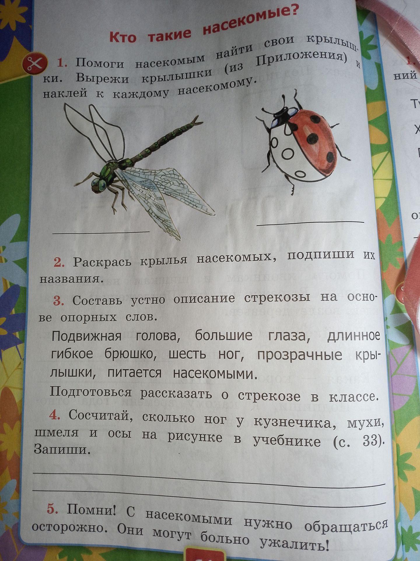 Задание подразумевает работу с приложением к учебнику, где находятся вырезанные крылья насекомых. Необходимо подобрать крылья к каждому насекомому и приклеить их.