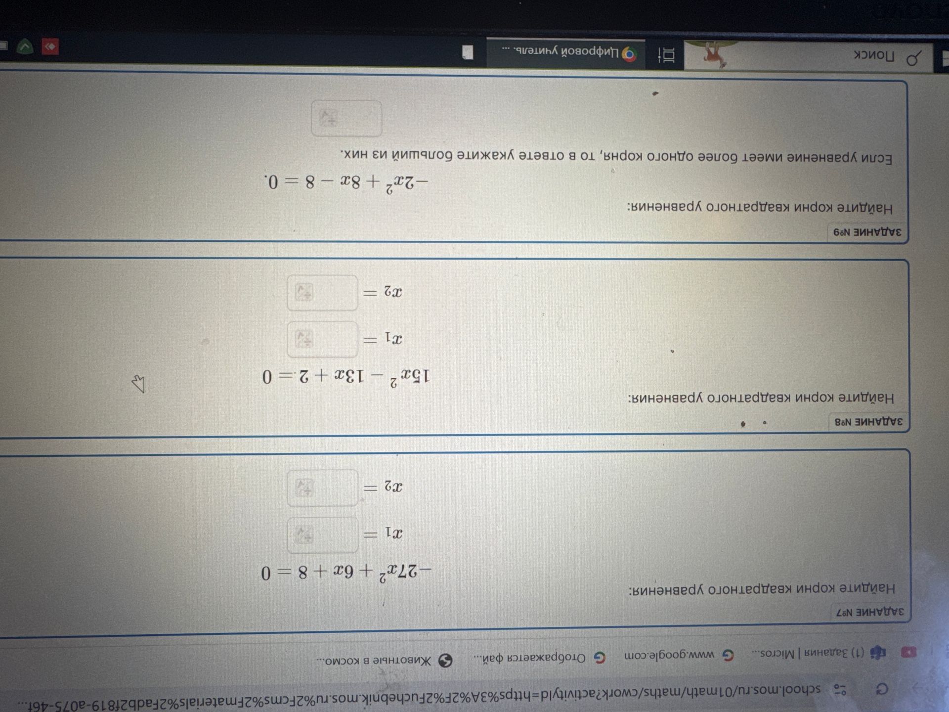 $$D = 8^2 - 4 \cdot (-2) \cdot (-8) = 64 - 64 = 0$$2. Найдем корни уравнения: