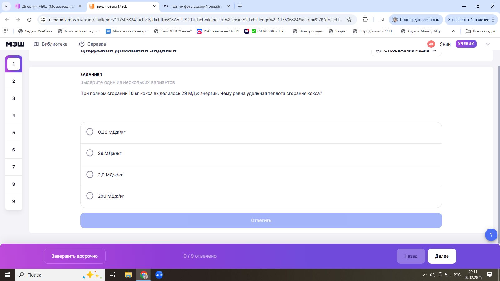 $$q = \frac{29 \text{ МДж}}{10 \text{ кг}} = 2.9 \frac{\text{МДж}}{\text{кг}}$$.