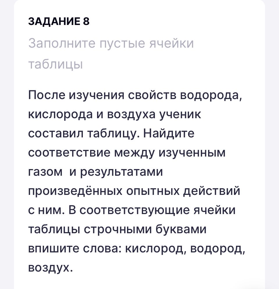 Для решения данной задачи, необходимо заполнить пустые ячейки таблицы, основываясь на знаниях о свойствах водорода, кислорода и воздуха.