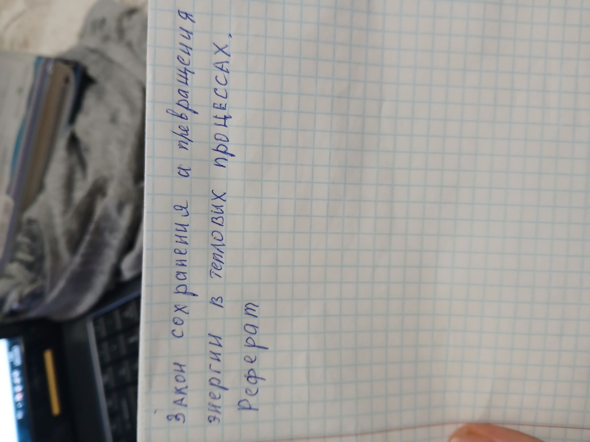 Таким образом, текст на изображении содержит название реферата по физике, посвященного закону сохранения и превращения энергии в тепловых процессах.
