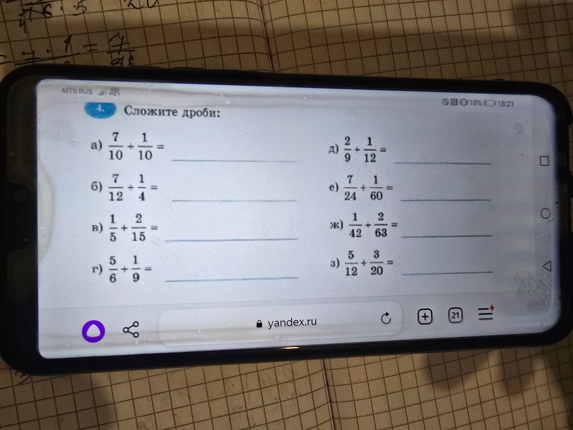 Для сложения дробей с разными знаменателями, нужно привести дроби к общему знаменателю, затем сложить числители, а знаменатель оставить прежним.\( \frac{a}{c} + \frac{b}{d} = \frac{ad+bc}{cd} \)