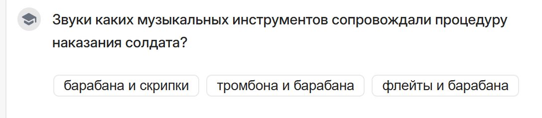 Известно, что для сопровождения наказания солдата использовались звуки барабана, чтобы создать атмосферу строгости и дисциплины. Другие инструменты, такие как скрипка, тромбон и флейта, обычно не ассоциируются с этой процедурой.